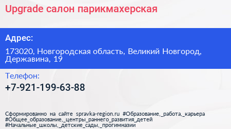Upgrade, салон-парикмахерская по адресу 173020, Новгородская область, Великий Новгород, Державина, 19 в дальнейшем Организация, размещена в следующих категориях: