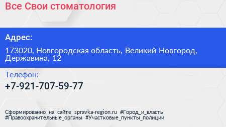Все Свои, стоматология по адресу 173020, Новгородская область, Великий Новгород, Державина, 12 в дальнейшем Организация, размещена в следующих категориях: