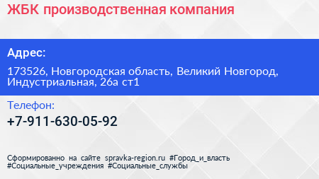 ЖБК, производственная компания по адресу 173526, Новгородская область, Великий Новгород, Индустриальная, 26а ст1 в дальнейшем Организация, размещена в следующих категориях:
