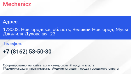 Mechanicz по адресу 173003, Новгородская область, Великий Новгород, Мусы Джалиля-Духовская, 23 в дальнейшем Организация, размещена в следующих категориях: