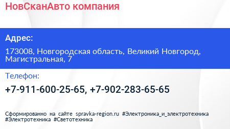 НовСканАвто, компания по адресу 173008, Новгородская область, Великий Новгород, Магистральная, 7 в дальнейшем Организация, размещена в следующих категориях: