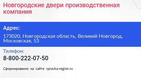 Новгородские двери, производственная компания по адресу 173020, Новгородская область, Великий Новгород, Московская, 53 в дальнейшем Организация, размещена в следующих категориях: