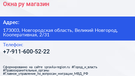 Окна.ру, магазин по адресу 173003, Новгородская область, Великий Новгород, Кооперативная, 2/31 в дальнейшем Организация, размещена в следующих категориях: