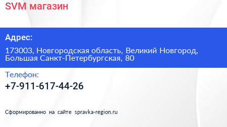 SVM, магазин по адресу 173003, Новгородская область, Великий Новгород, Большая Санкт-Петербургская, 80 в дальнейшем Организация, размещена в следующих категориях: