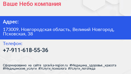Ваше-Небо, компания по адресу 173009, Новгородская область, Великий Новгород, Псковская, 38 в дальнейшем Организация, размещена в следующих категориях: