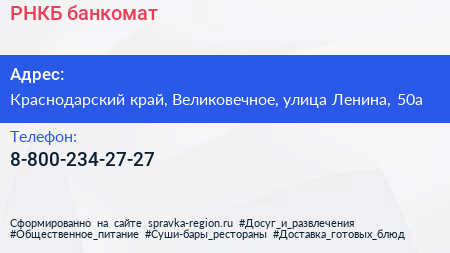 РНКБ, банкомат по адресу Краснодарский край, Великовечное, улица Ленина, 50а в дальнейшем Организация, размещена в следующих категориях: