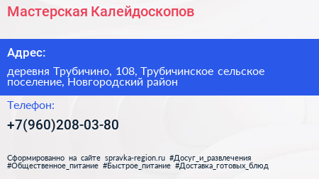 Мастерская Калейдоскопов по адресу деревня Трубичино, 108, Трубичинское сельское поселение, Новгородский район в дальнейшем Организация, размещена в следующих категориях: