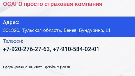ОСАГО просто, страховая компания по адресу 301320, Тульская область, Венев, Бундурина, 11 в дальнейшем Организация, размещена в следующих категориях: