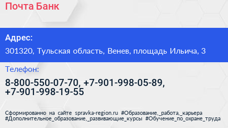 Почта Банк по адресу 301320, Тульская область, Венев, площадь Ильича, 3 в дальнейшем Организация, размещена в следующих категориях: