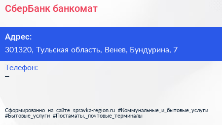 СберБанк, банкомат по адресу 301320, Тульская область, Венев, Бундурина, 7 в дальнейшем Организация, размещена в следующих категориях: