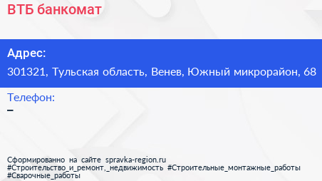 ВТБ, банкомат по адресу 301321, Тульская область, Венев, Южный микрорайон, 68 в дальнейшем Организация, размещена в следующих категориях: