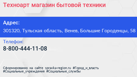 Техноарт, магазин бытовой техники по адресу 301320, Тульская область, Венев, Большие Городенцы, 58 в дальнейшем Организация, размещена в следующих категориях: