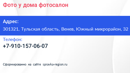 Фото у дома, фотосалон по адресу 301321, Тульская область, Венев, Южный микрорайон, 32 в дальнейшем Организация, размещена в следующих категориях: