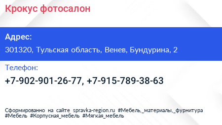 Крокус, фотосалон по адресу 301320, Тульская область, Венев, Бундурина, 2 в дальнейшем Организация, размещена в следующих категориях: