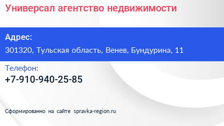 Универсал, агентство недвижимости по адресу 301320, Тульская область, Венев, Бундурина, 11 в дальнейшем Организация, размещена в следующих категориях:
