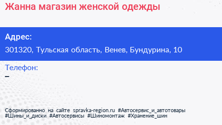 Жанна, магазин женской одежды по адресу 301320, Тульская область, Венев, Бундурина, 10 в дальнейшем Организация, размещена в следующих категориях: