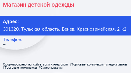 Магазин детской одежды по адресу 301320, Тульская область, Венев, Красноармейская, 2 к2 в дальнейшем Организация, размещена в следующих категориях:
