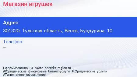 Магазин игрушек по адресу 301320, Тульская область, Венев, Бундурина, 10 в дальнейшем Организация, размещена в следующих категориях: