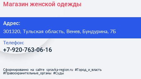 Магазин женской одежды по адресу 301320, Тульская область, Венев, Бундурина, 7Б в дальнейшем Организация, размещена в следующих категориях: