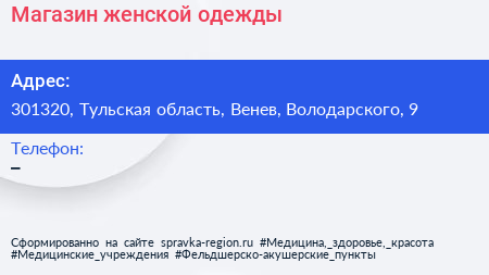 Магазин женской одежды по адресу 301320, Тульская область, Венев, Володарского, 9 в дальнейшем Организация, размещена в следующих категориях: