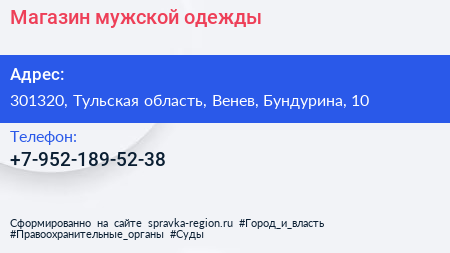 Магазин мужской одежды по адресу 301320, Тульская область, Венев, Бундурина, 10 в дальнейшем Организация, размещена в следующих категориях: