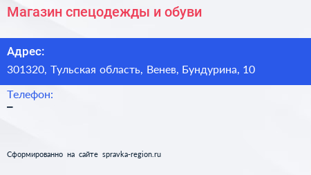 Магазин спецодежды и обуви по адресу 301320, Тульская область, Венев, Бундурина, 10 в дальнейшем Организация, размещена в следующих категориях: