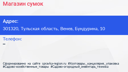 Магазин сумок по адресу 301320, Тульская область, Венев, Бундурина, 10 в дальнейшем Организация, размещена в следующих категориях:
