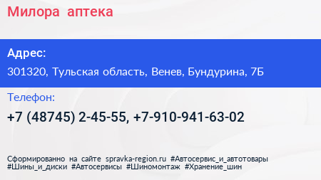 Милора+, аптека по адресу 301320, Тульская область, Венев, Бундурина, 7Б в дальнейшем Организация, размещена в следующих категориях: