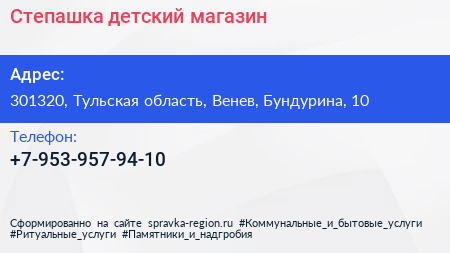 Степашка, детский магазин по адресу 301320, Тульская область, Венев, Бундурина, 10 в дальнейшем Организация, размещена в следующих категориях: