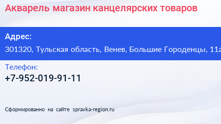 Акварель, магазин канцелярских товаров по адресу 301320, Тульская область, Венев, Большие Городенцы, 11а в дальнейшем Организация, размещена в следующих категориях: