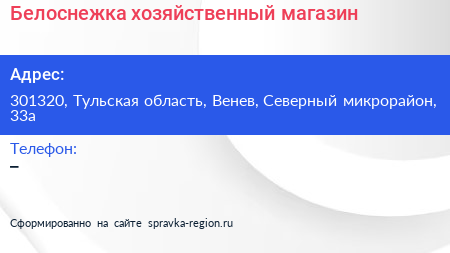Белоснежка, хозяйственный магазин по адресу 301320, Тульская область, Венев, Северный микрорайон, 33а в дальнейшем Организация, размещена в следующих категориях: