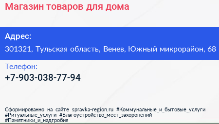 Магазин товаров для дома по адресу 301321, Тульская область, Венев, Южный микрорайон, 68 в дальнейшем Организация, размещена в следующих категориях: