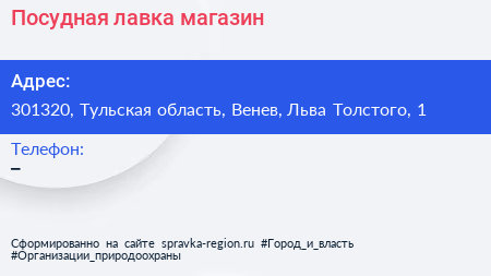 Посудная лавка, магазин по адресу 301320, Тульская область, Венев, Льва Толстого, 1 в дальнейшем Организация, размещена в следующих категориях: