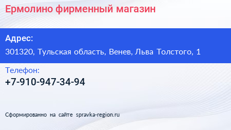 Ермолино, фирменный магазин по адресу 301320, Тульская область, Венев, Льва Толстого, 1 в дальнейшем Организация, размещена в следующих категориях: