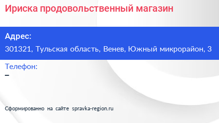 Ириска, продовольственный магазин по адресу 301321, Тульская область, Венев, Южный микрорайон, 3 в дальнейшем Организация, размещена в следующих категориях: