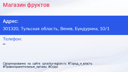 Магазин фруктов по адресу 301320, Тульская область, Венев, Бундурина, 10/1 в дальнейшем Организация, размещена в следующих категориях: