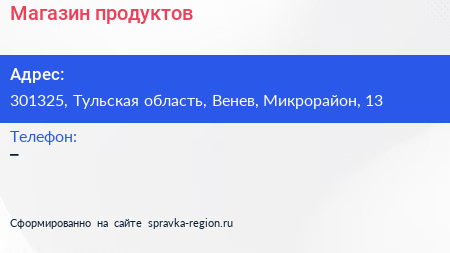Магазин продуктов по адресу 301325, Тульская область, Венев, Микрорайон, 13 в дальнейшем Организация, размещена в следующих категориях: