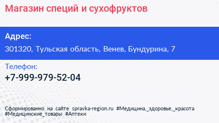 Магазин специй и сухофруктов по адресу 301320, Тульская область, Венев, Бундурина, 7 в дальнейшем Организация, размещена в следующих категориях: