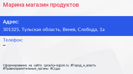 Марина, магазин продуктов по адресу 301325, Тульская область, Венев, Слобода, 1а в дальнейшем Организация, размещена в следующих категориях: