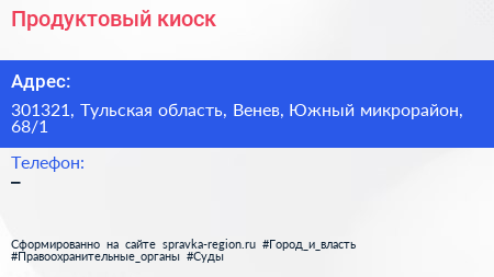 Продуктовый киоск по адресу 301321, Тульская область, Венев, Южный микрорайон, 68/1 в дальнейшем Организация, размещена в следующих категориях: