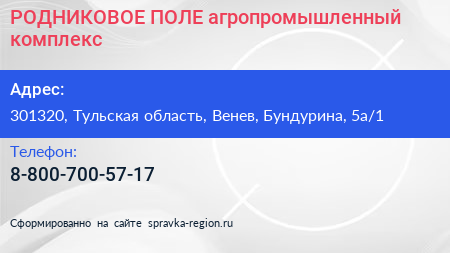 РОДНИКОВОЕ ПОЛЕ, агропромышленный комплекс по адресу 301320, Тульская область, Венев, Бундурина, 5а/1 в дальнейшем Организация, размещена в следующих категориях: