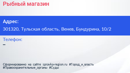Рыбный магазин по адресу 301320, Тульская область, Венев, Бундурина, 10/2 в дальнейшем Организация, размещена в следующих категориях: