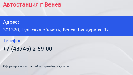 Автостанция, г. Венев по адресу 301320, Тульская область, Венев, Бундурина, 1а в дальнейшем Организация, размещена в следующих категориях: