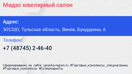 Мидас, ювелирный салон по адресу 301320, Тульская область, Венев, Бундурина, 6 в дальнейшем Организация, размещена в следующих категориях: