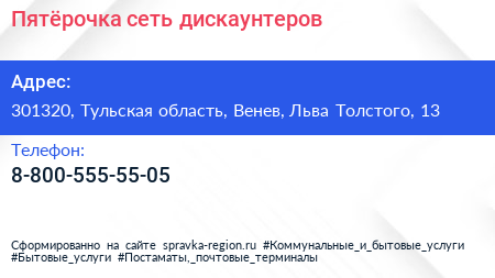 Пятёрочка, сеть дискаунтеров по адресу 301320, Тульская область, Венев, Льва Толстого, 13 в дальнейшем Организация, размещена в следующих категориях: