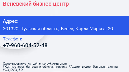 Веневский, бизнес-центр по адресу 301320, Тульская область, Венев, Карла Маркса, 20 в дальнейшем Организация, размещена в следующих категориях: