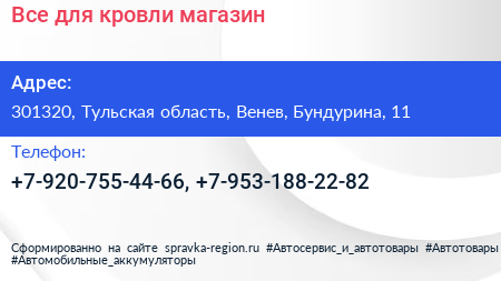 Все для кровли, магазин по адресу 301320, Тульская область, Венев, Бундурина, 11 в дальнейшем Организация, размещена в следующих категориях: