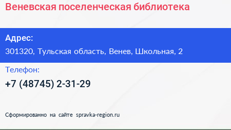 Веневская поселенческая библиотека по адресу 301320, Тульская область, Венев, Школьная, 2 в дальнейшем Организация, размещена в следующих категориях: