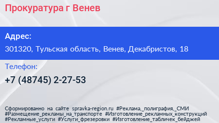 Прокуратура, г. Венев по адресу 301320, Тульская область, Венев, Декабристов, 18 в дальнейшем Организация, размещена в следующих категориях: