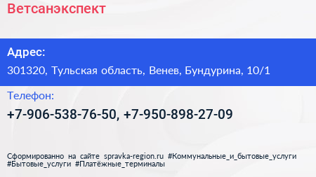 Ветсанэкспект по адресу 301320, Тульская область, Венев, Бундурина, 10/1 в дальнейшем Организация, размещена в следующих категориях: